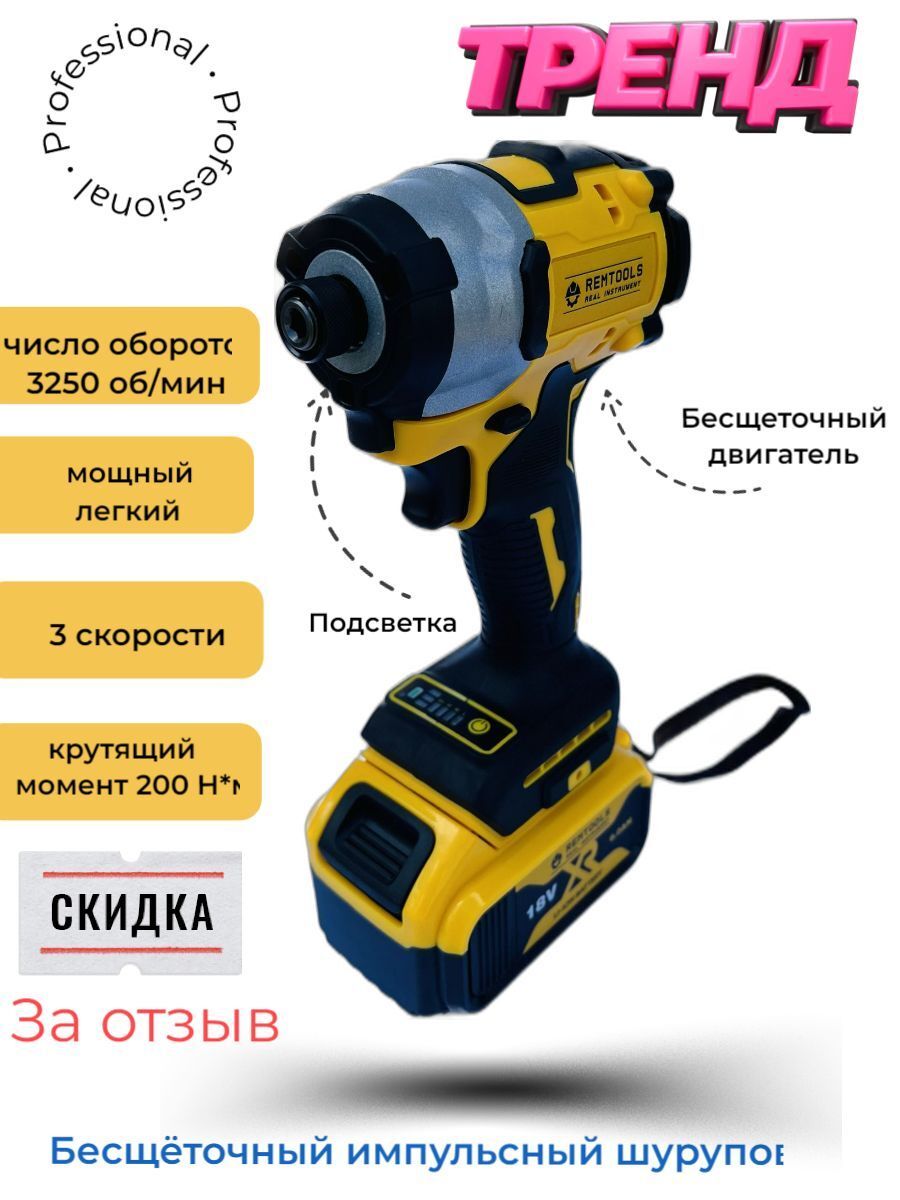 Наш ударный шуруповерт Remtools 18V- это инструмент, который обеспечивает быстрое и эффективное затягивание винтов в твердые материалы, такие как дерево, металл и бетон.